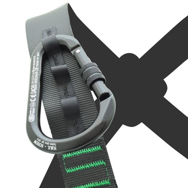 The seat harness and chest harness are connected via a lark's head extension.